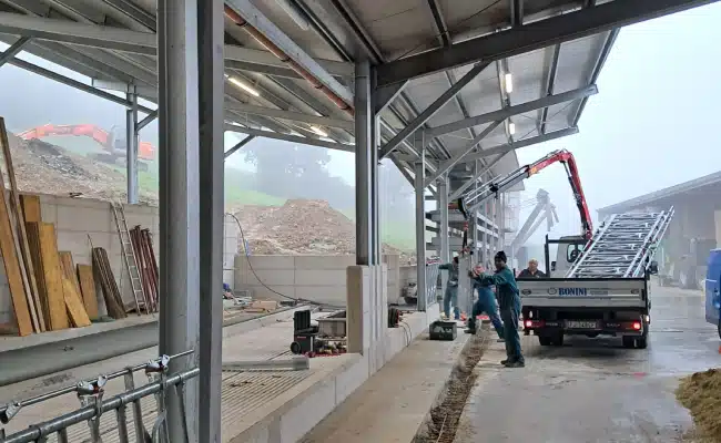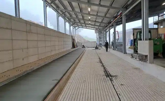 Ampliamento per ammodernamento di edificio produttivo adibito a stalla, con fondazioni profonde, muri di sostegno in c.a. e struttura a telaio in acciaio.